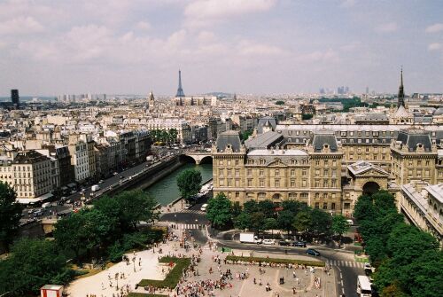City-scape from top of Notre Dame, Eiffel Tower in the distance.