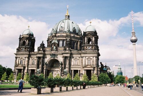 Approaching the Berlin Cathedral. Berlin Cathedral is the former court cathedral of Prussia's royal family, the Hohenzollern and was conceived as a protestant answer to St. Peter's Basilica in Rome.