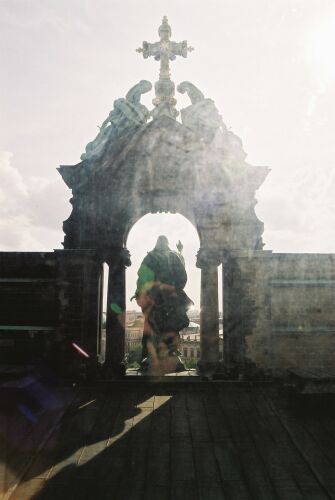 Shadowy figure hiding under the cross.